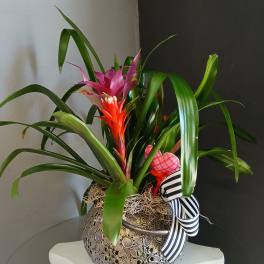 Price: $64.99 Pink bromeliad (guzmania) + fern (blue pedestal ceramic pot) Product Tags: Next-day Delivery